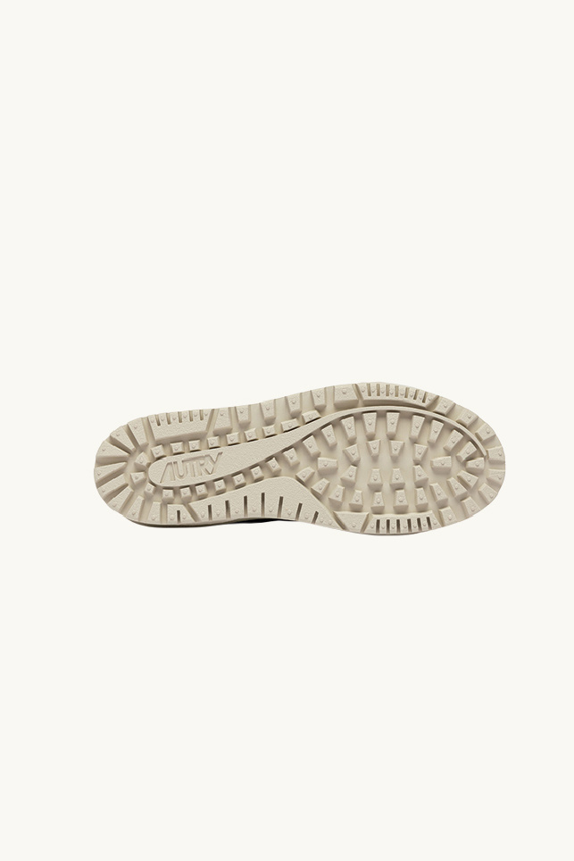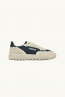 Le modèle est complété par des lacets plats en coton beige, ainsi qu’un contrefort en daim bleu orné du logo emblématique de la marque.