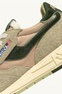 Elles présentent des empiècements en faux poils de poney verts sur les côtés, la languette et le contrefort, une semelle en caoutchouc ainsi qu’une fermeture à lacets en coton. Le contrefort est orné du logo de la marque, brodé en beige.