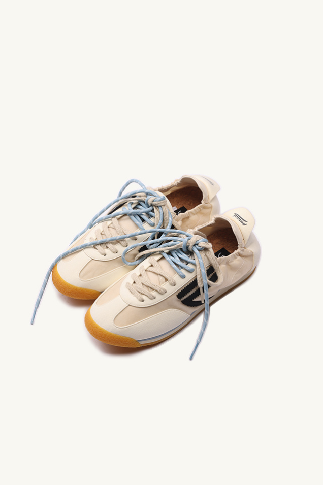 Inspirées des années 80, elles présentent une tige fine et souple, légèrement resserrée à la cheville, et sont ornées du logo de la marque en cuir végétal noir sur les côtés.