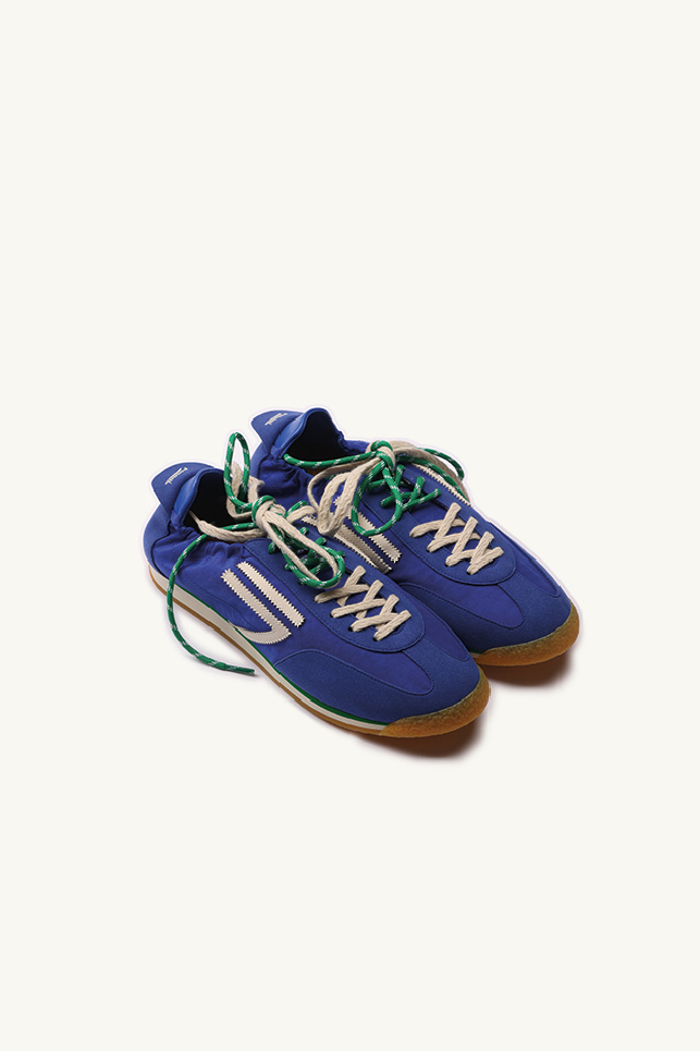 Le modèle est complété par un double laçage aux couleurs contrastées, une semelle extérieure en caoutchouc, ainsi qu’un contrefort en cuir végétal bleu.