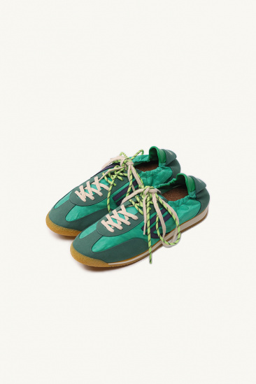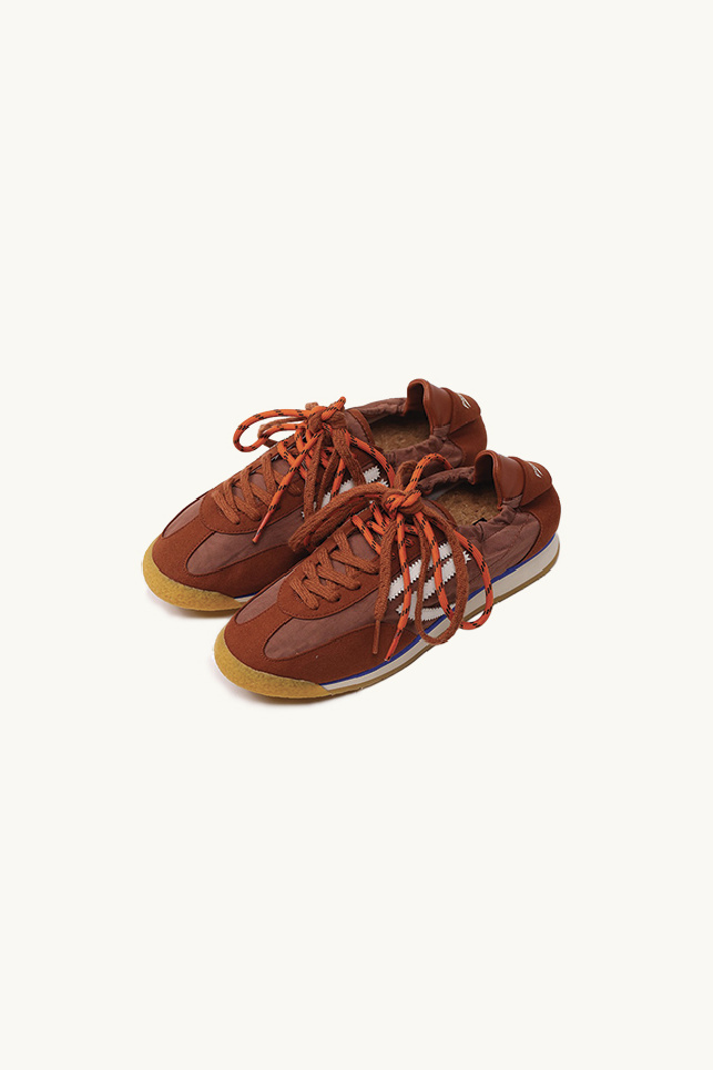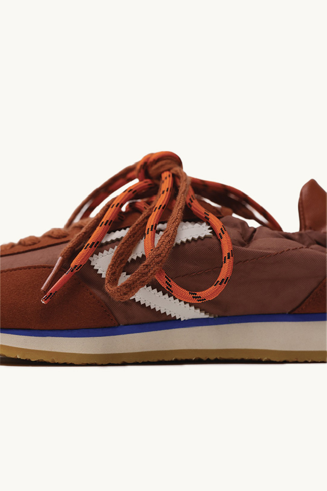 Le modèle est complété par un double laçage aux couleurs contrastées, une semelle extérieure en caoutchouc, ainsi qu’un contrefort en cuir végétal marron.