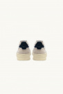 Le modèle est complété par un laçage en coton, une languette ornée d’une étiquette et d'un contrefort en cuir bleu foncé souligné du logo emblématique de la marque.
