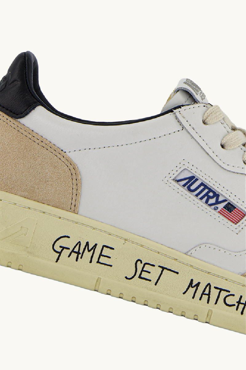 Elles présentent des empiècements en daim beiges, un avant-pied perforé et une semelle en caoutchouc marquée de l’inscription “Game Set Match”.