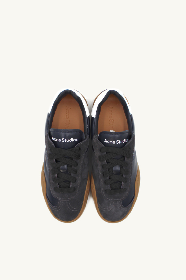 Baskets Bars M à lacets, anthracite et marron, de la marque Acne Studios, cuir d'agneau et daim, bout rond, logo au centre, semelle en caoutchouc griffée.