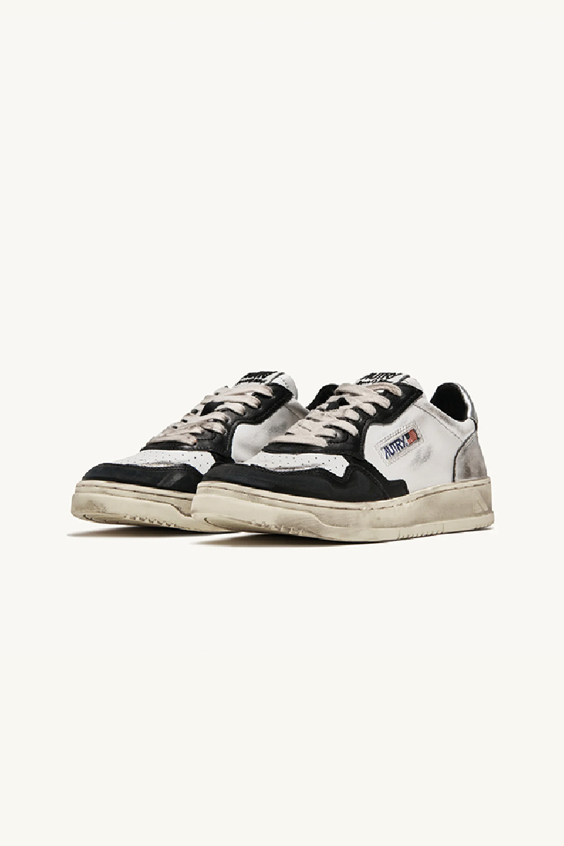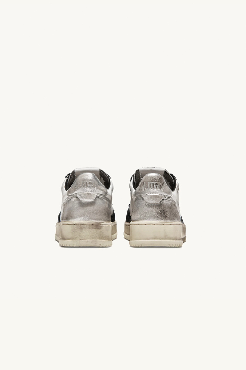 Baskets Autry, modèle Super Vintage Low, en cuir blanc, noir et argent, à effet vieilli.