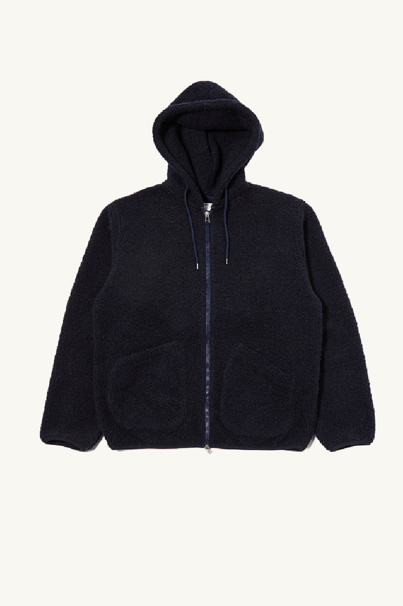 Sweat à capuche en polaire alvar navy, de la marque Universal Works.