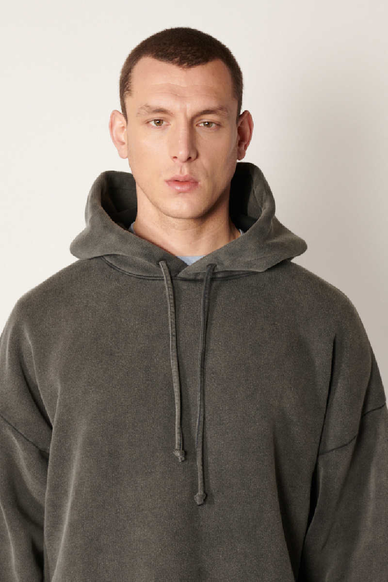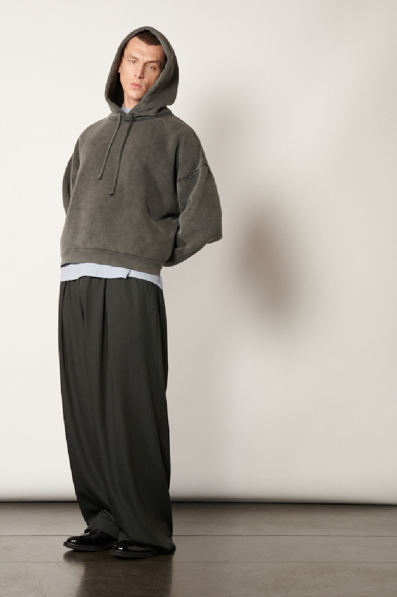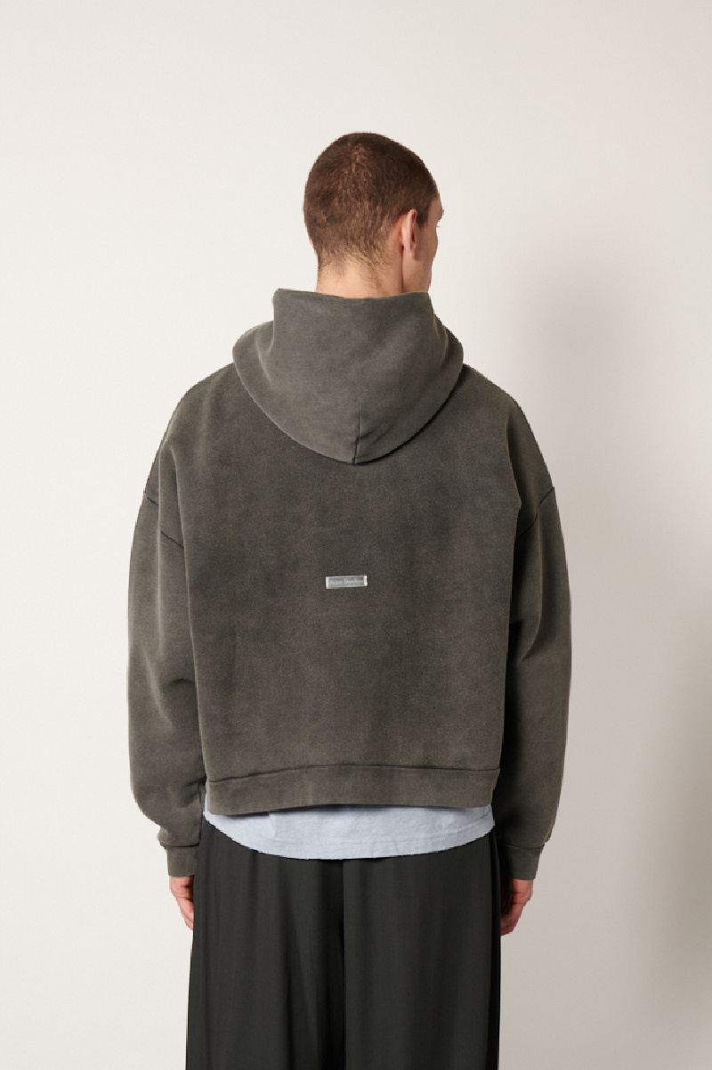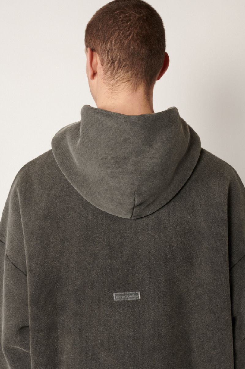 Sweat à capuche réglable Acne Studios, Noir délavé, coupe courte et oversize, écriture "Acné Studios" sur empiècements transparent au milieu du dos.