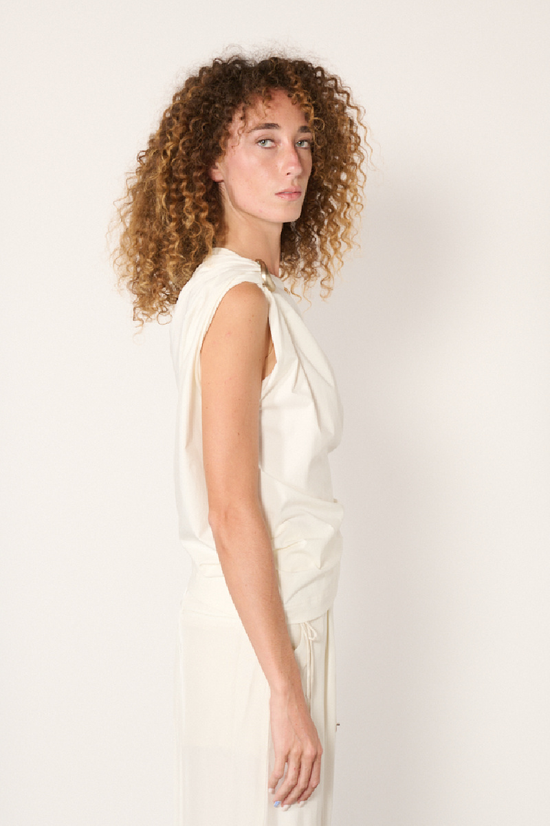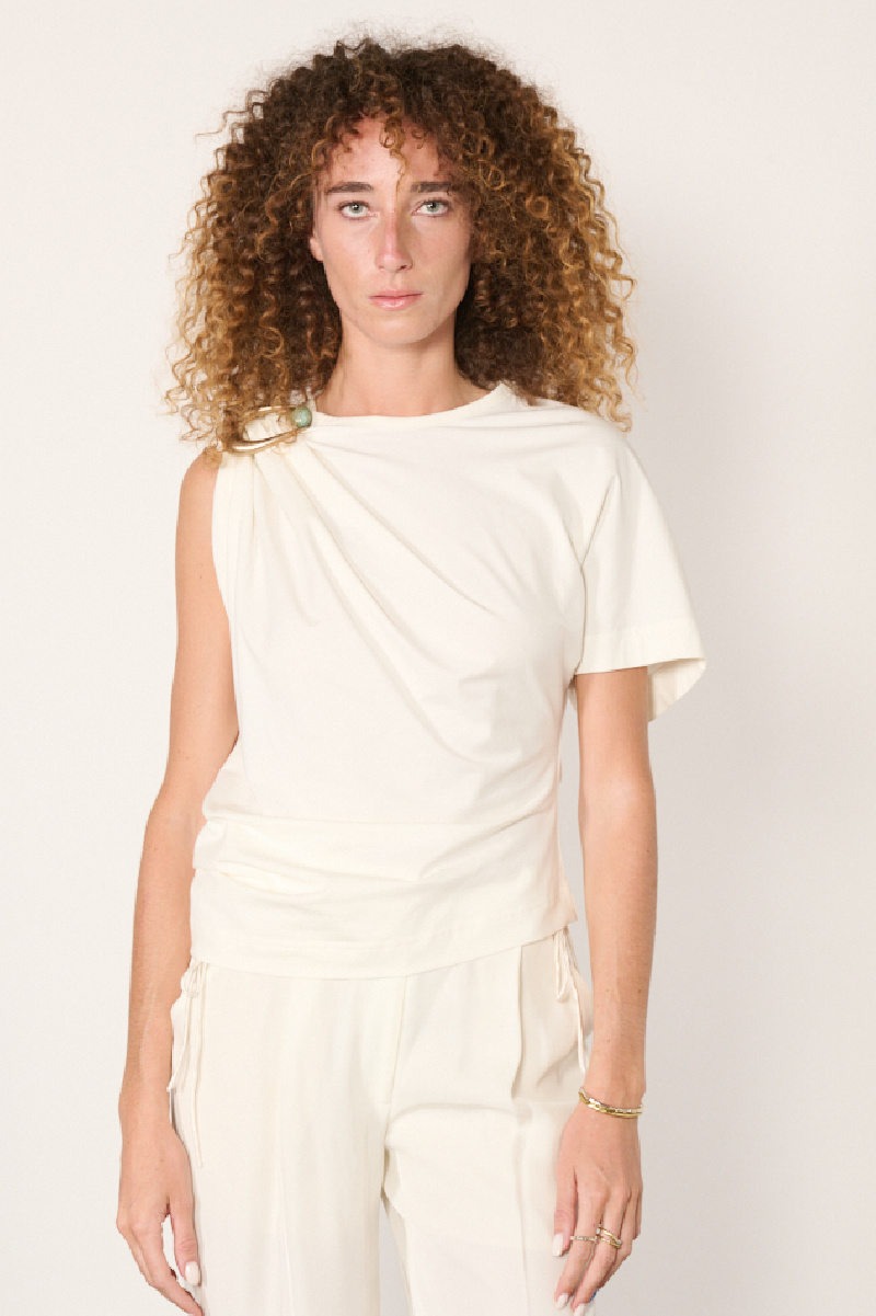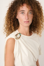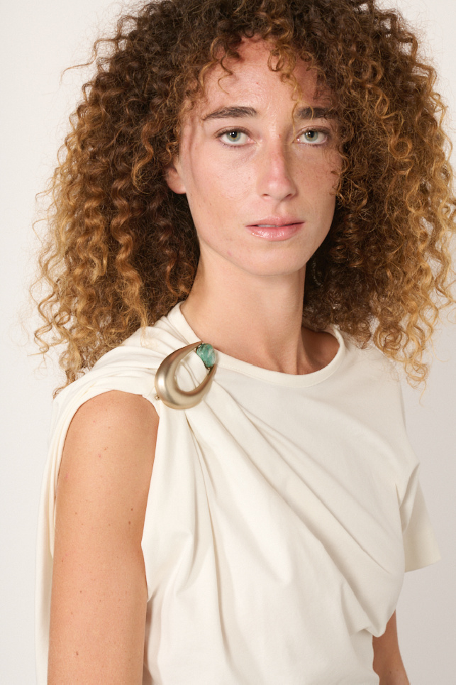 Il offre une coupe cintrée et déstructurée, avec une manche asymétrique à épaule froncée maintenue par un anneau en métal brossé doré, orné d'une pierre naturelle bleu turquoise.
