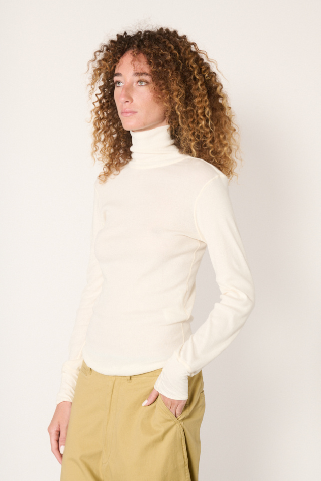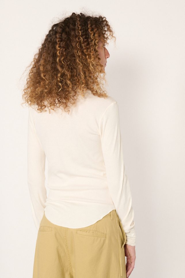 Confectionné en coton côtelé, ce t-shirt épouse délicatement la silhouette, avec un col roulé et une base arrondie qui offre un tombé élégant et fluide.