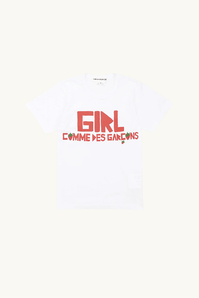 Il arbore une coupe ajustée à manches courtes, un imprimé rouge Girl Comme des Garçons avec des fraises sur l’avant, et une impression noire dans le bas du dos.