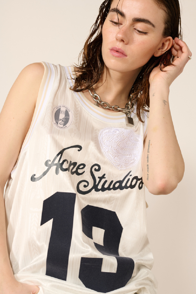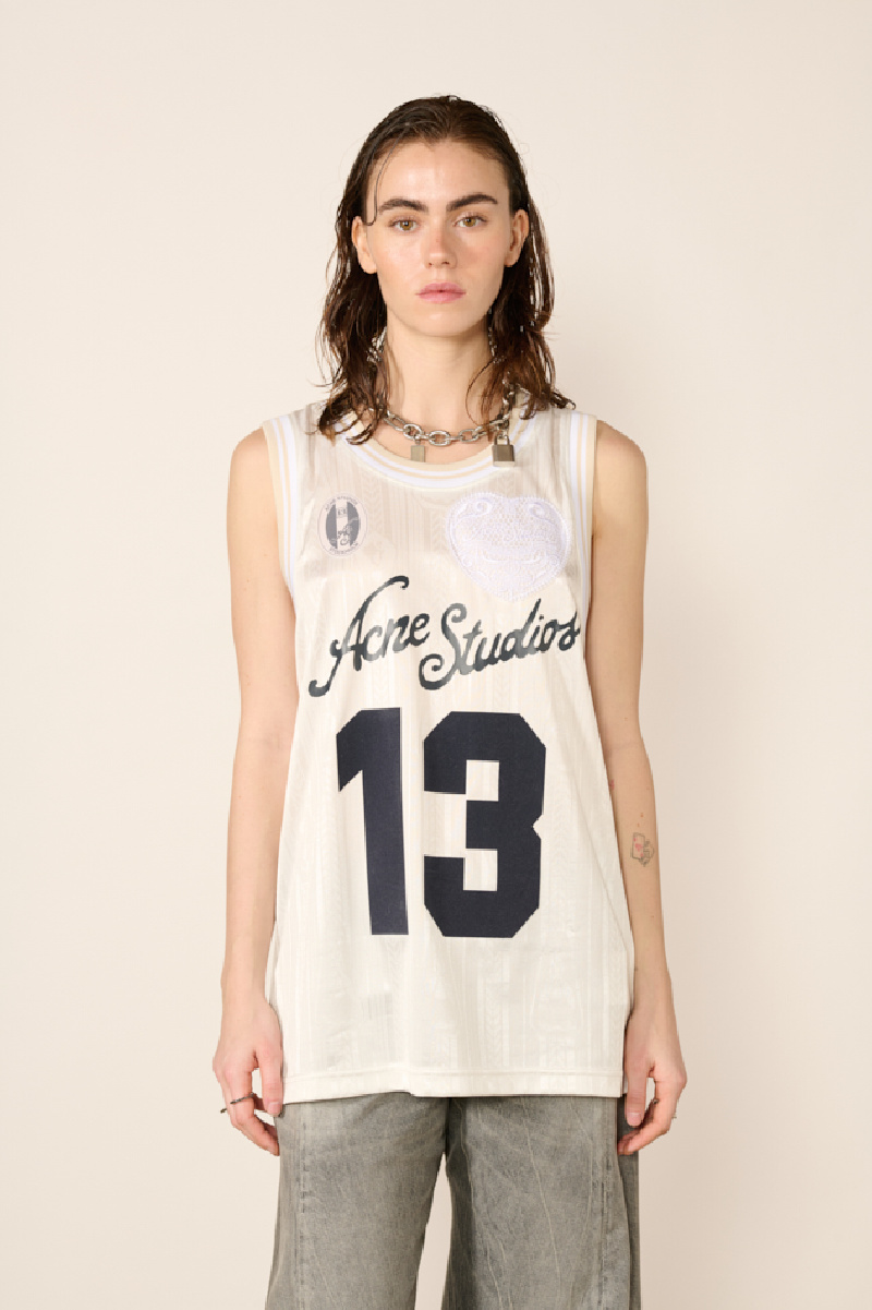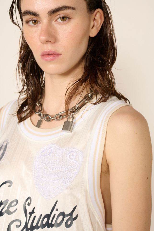 Il présente une coupe décontractée inspirée des maillots de basket, avec un col classique, de larges emmanchures et des finitions en bords-côtes.