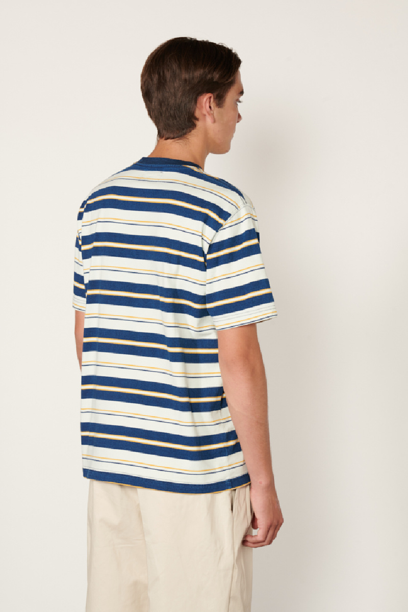 T-shirt en coton semi-épais gratté à rayures bleues, jaunes et beige, de la marque Beams +.