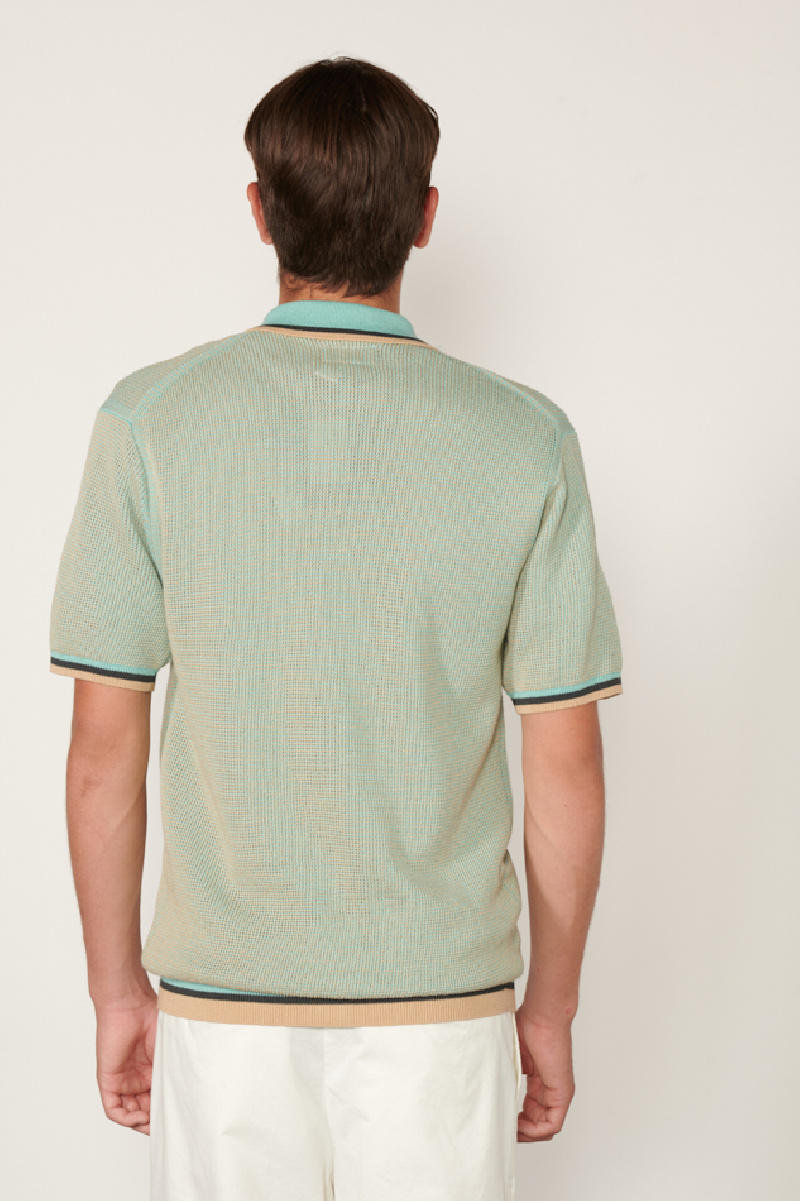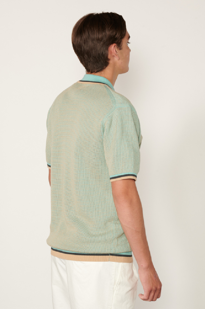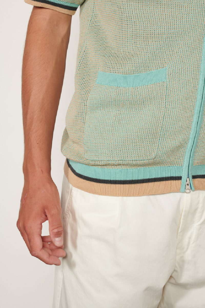 Polo zippé en maille confectionné dans un mélange de coton et de ramie, à dominance bleu et beige, de la marque Beams +.