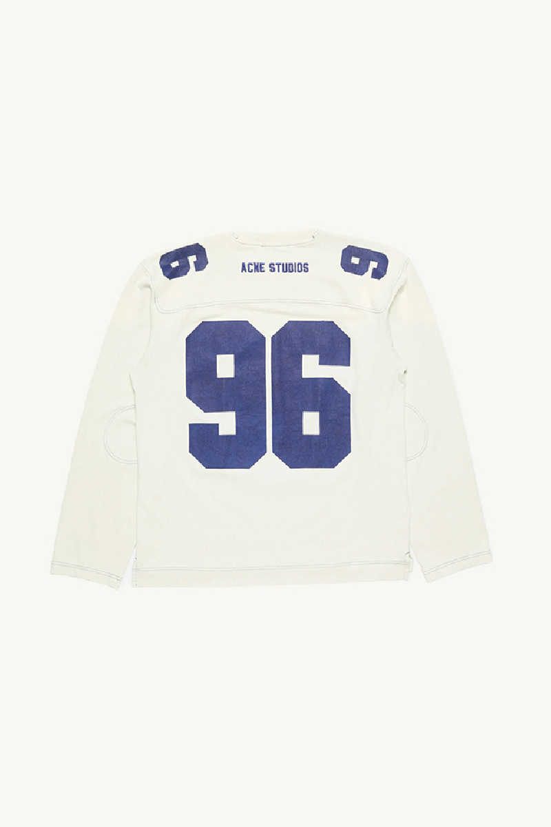 Inspiré des maillots de sport, son design se distingue par un numéro 96 floqué en bleu à l’avant, aux épaules et au dos, complété par une broderie « Acne Studios » positionnée en haut du dos.