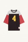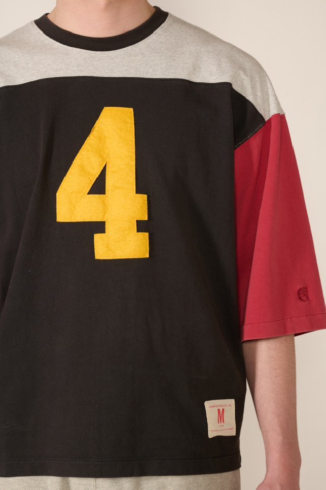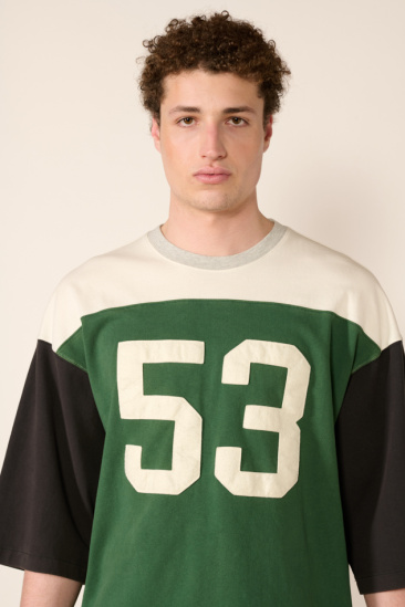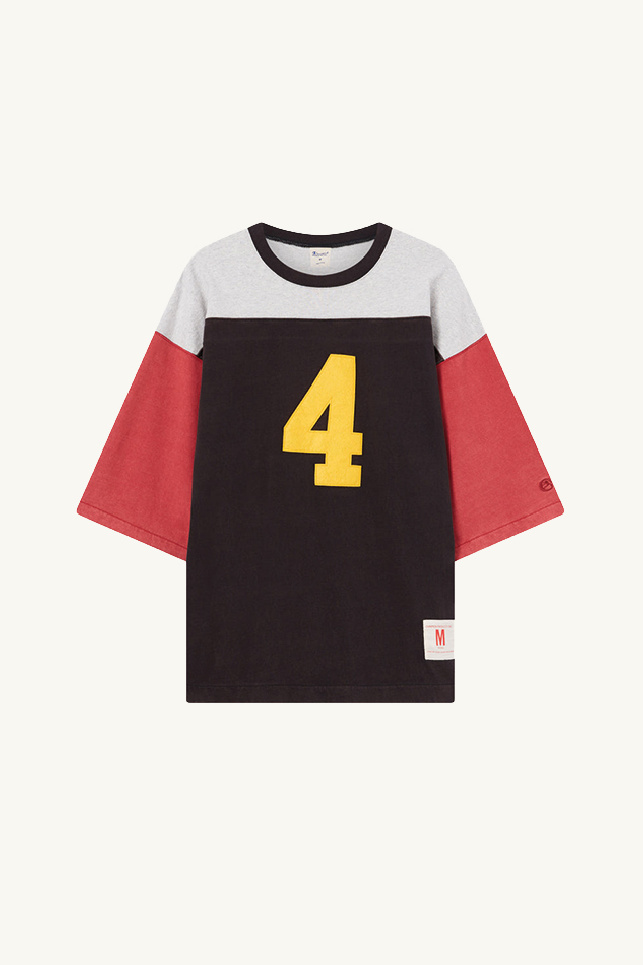 Inspiré du football américain des années 70, il offre une coupe décontractée, des manches 3/4, un graphique numérique sur la poitrine, et des logos de la marque au niveau de l’ourlet et de la manche.