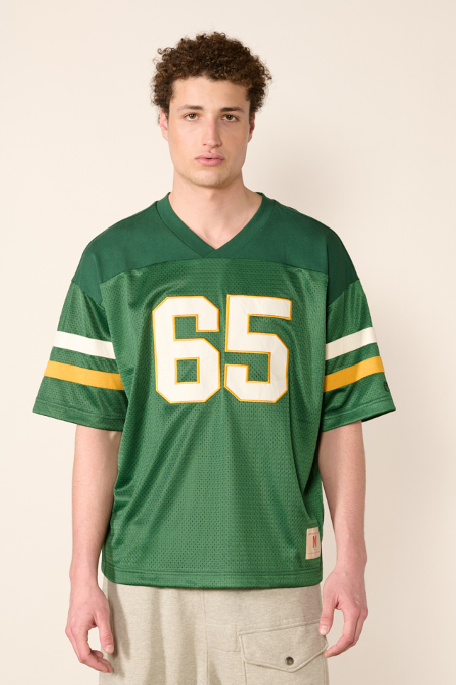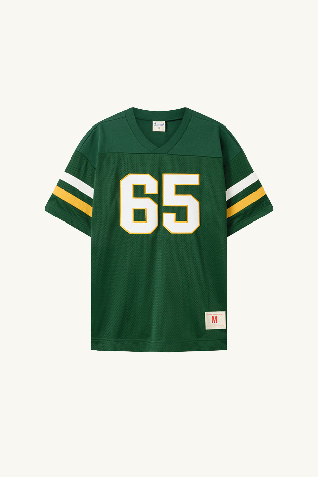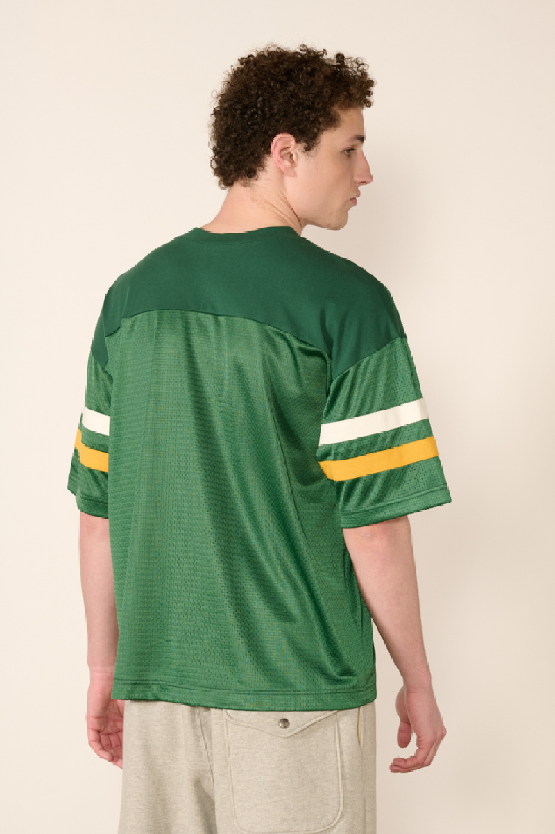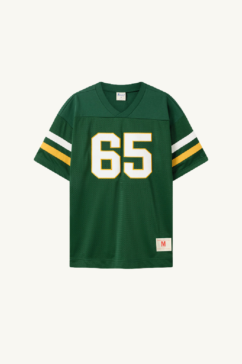 Pièce emblématique du sportswear d’archive revisité, son design se distingue par des manches courtes, un col V, des bandes contrastées sur les manches, un graphique numérique sur la poitrine, et des logos de la marque au niveau de l’ourlet et de la manche.