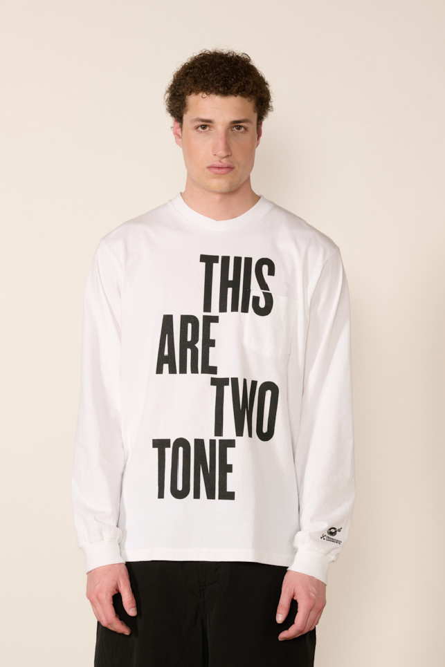 Le t-shirt se distingue par ses détails graphiques : une impression noire « this are two tone » sur le devant, associée à une impression tourne-disque sur la manche.