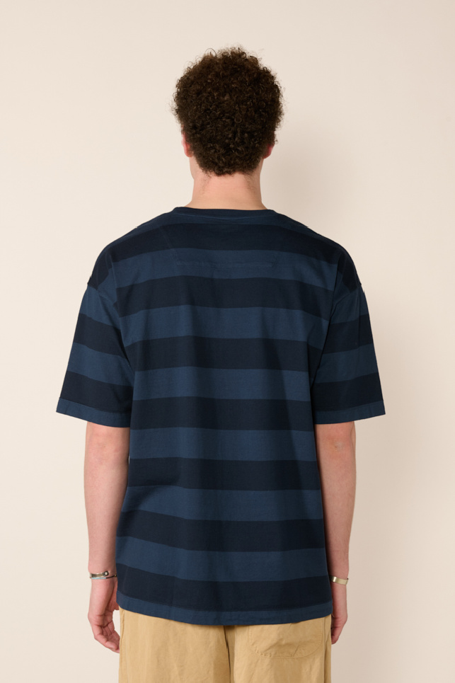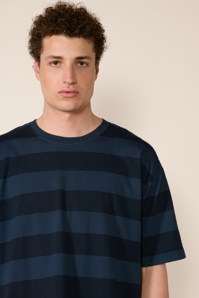 Le design se distingue par des rayures épaisses mêlant deux nuances de bleu foncé, pour un rendu graphique et moderne.