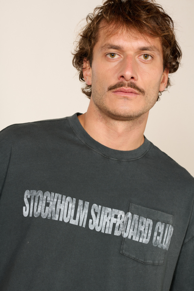 Il présente une coupe boxy à longueur taille, un col ras-du-cou, une poche poitrine et l’imprimé “Stockholm Surfboard Club” sur l'avant et la poche.