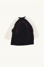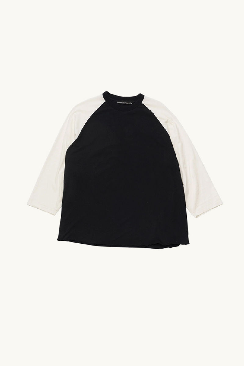 Il présente une coupe régulière à longueur taille, des manches raglan ¾ et un col contrasté, avec des manches et un col de couleur différente.