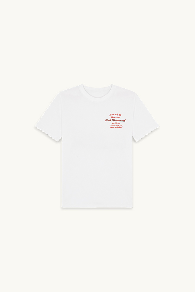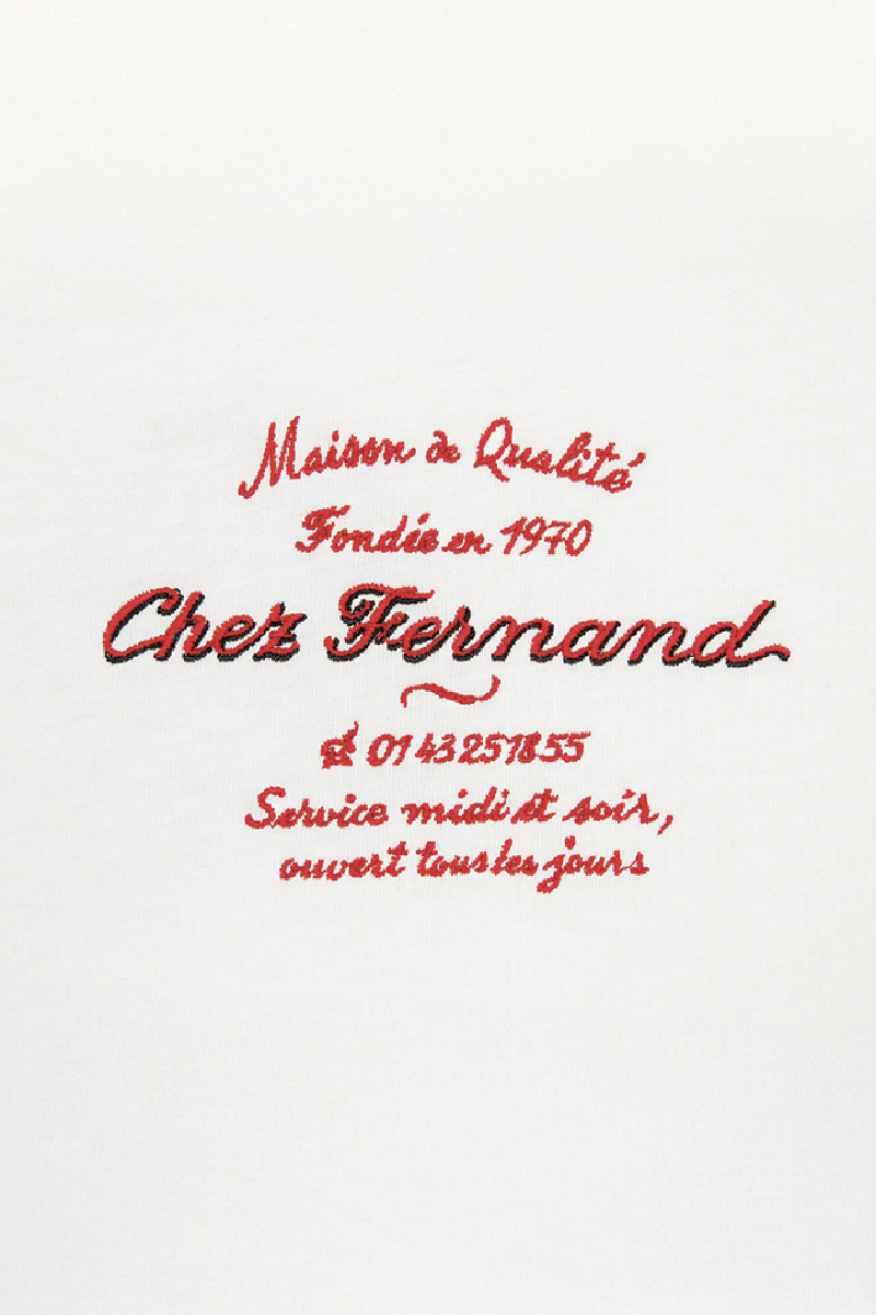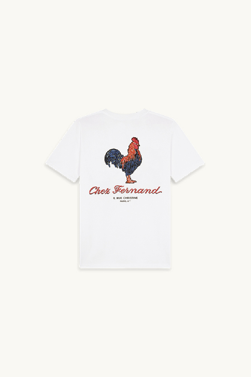 Sur le devant, une broderie “Chez Fernand” rouge est soulignée d’un léger ombrage noir, accompagnée de détails finement brodés en référence au restaurant, tandis qu’au dos une sérigraphie met en scène le coq iconique de la maison.