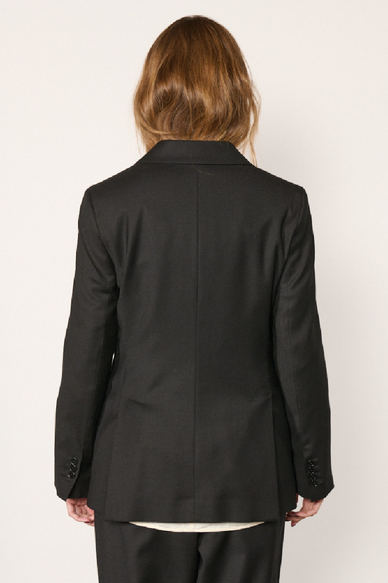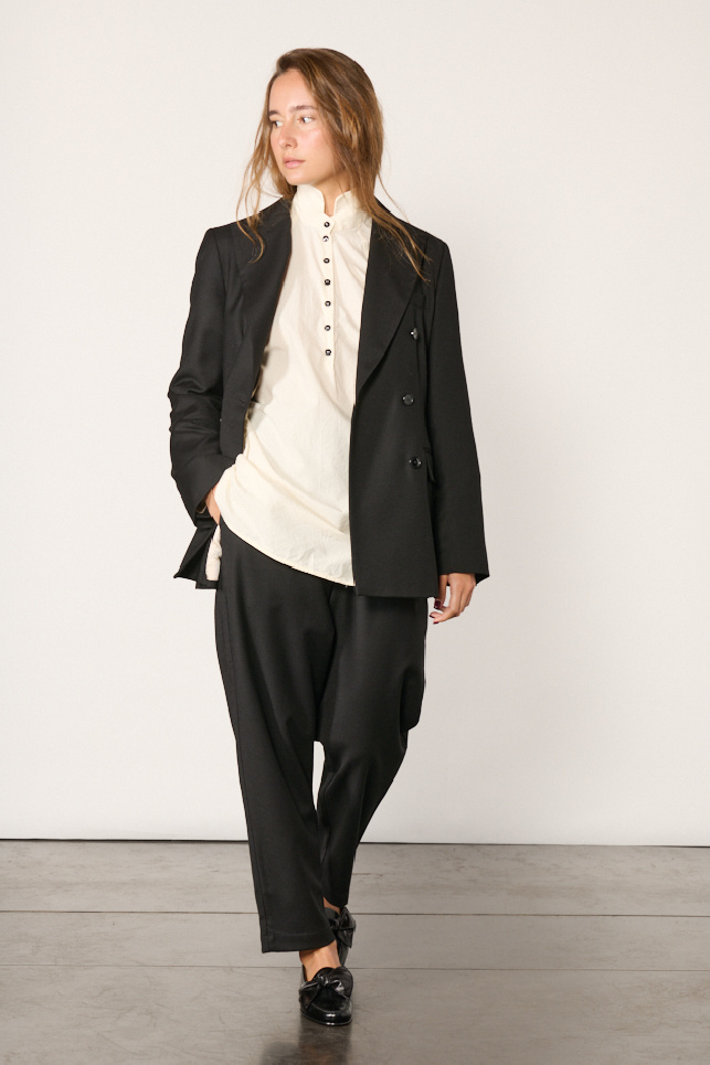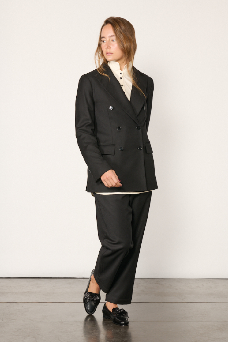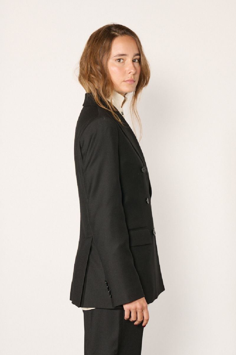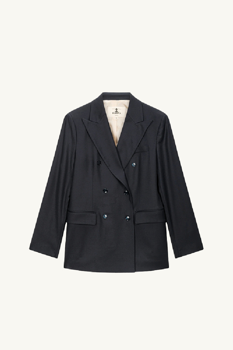 Blazer croisé confectionné en flanelle de laine noire de qualité premium, entièrement doublée, de la marque italienne Barena.