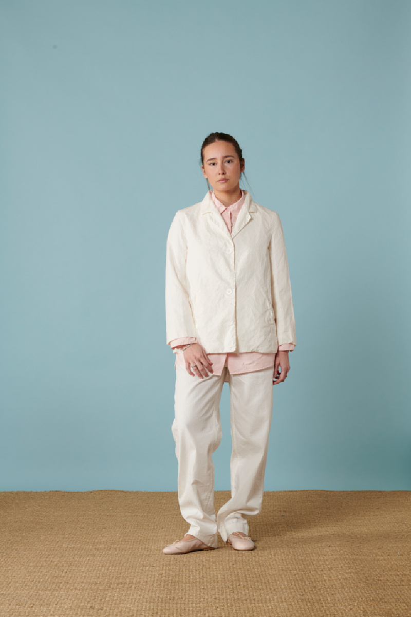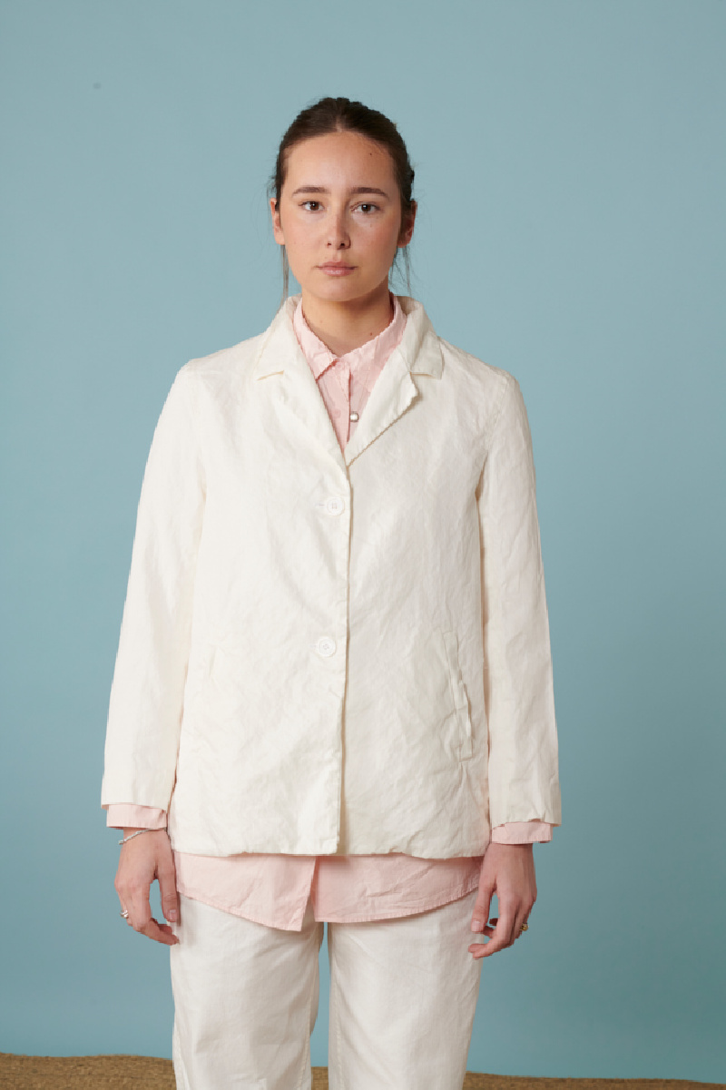 Veste Casey Casey, blanc, mélange de lin et coton, fermeture par boutons blanc, coupe "épaule droite", forme veste de tailleur, poches plaquées sur le devant.