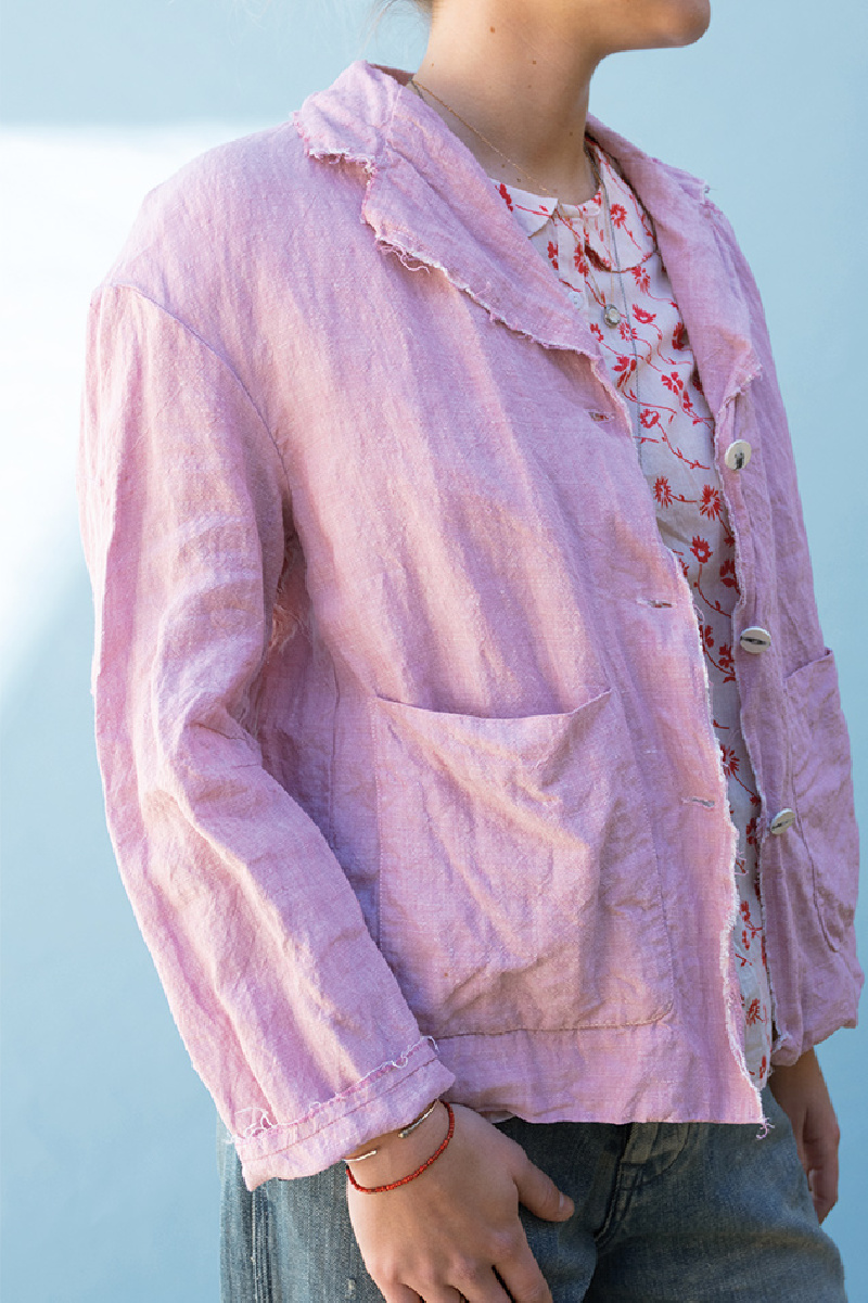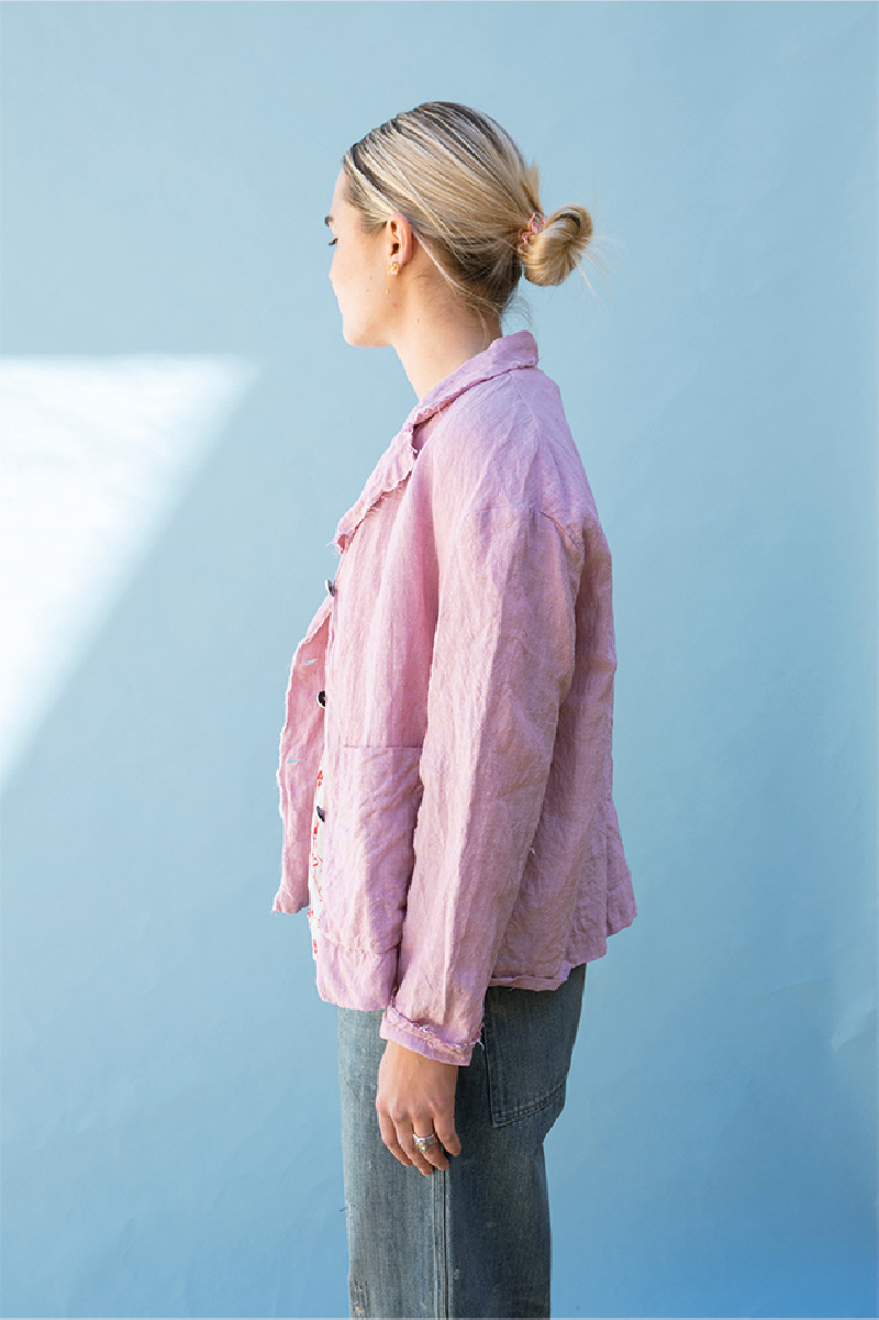 Veste en lin Buig Stan, Sula, couleur lilas, coupe classique, boutons blancs pour la fermeture, col V, manches longues, poches plaquées, effet froissé, fente sur le bas du dos, détails couture effilochés aux extrémités.