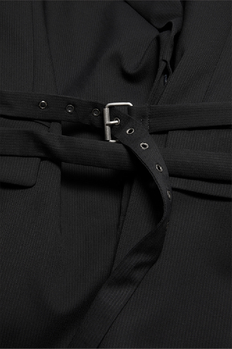Veste de tailleur, Acne Studios, couleur unie noire, coupe croisée donnant un effet ample, emmanchures et épaules structurées, longueur au niveau des hanches, ceinture à la taille et boutonnée à l'avant, deux poches passepoilées de chaque côté avant et une au niveau de la poitrine.
