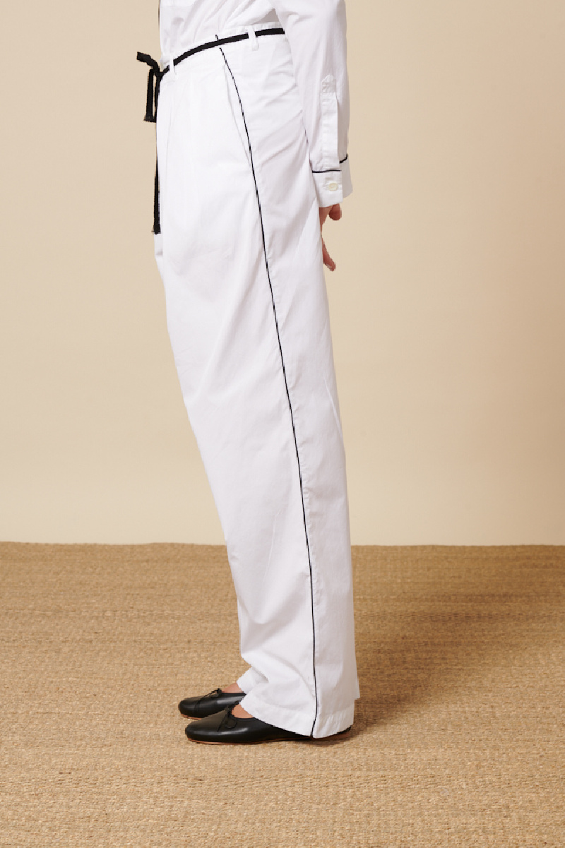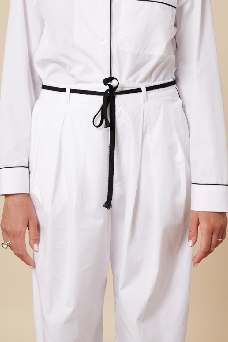 Le pantalon à pinces Badoero, de la marque Barena, en coton blanc, et un tissu léger, présente une coupe ample, avec deux poches de chaque côté, une ceinture en tissus noir, une fermeture par bouton et zip, et un liséré noir de chaque côté sur l'intégralité de la longueur.