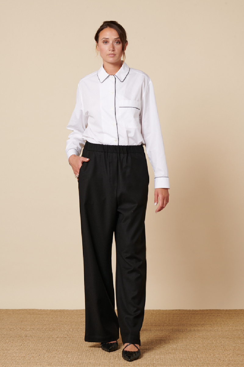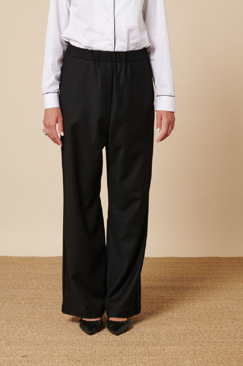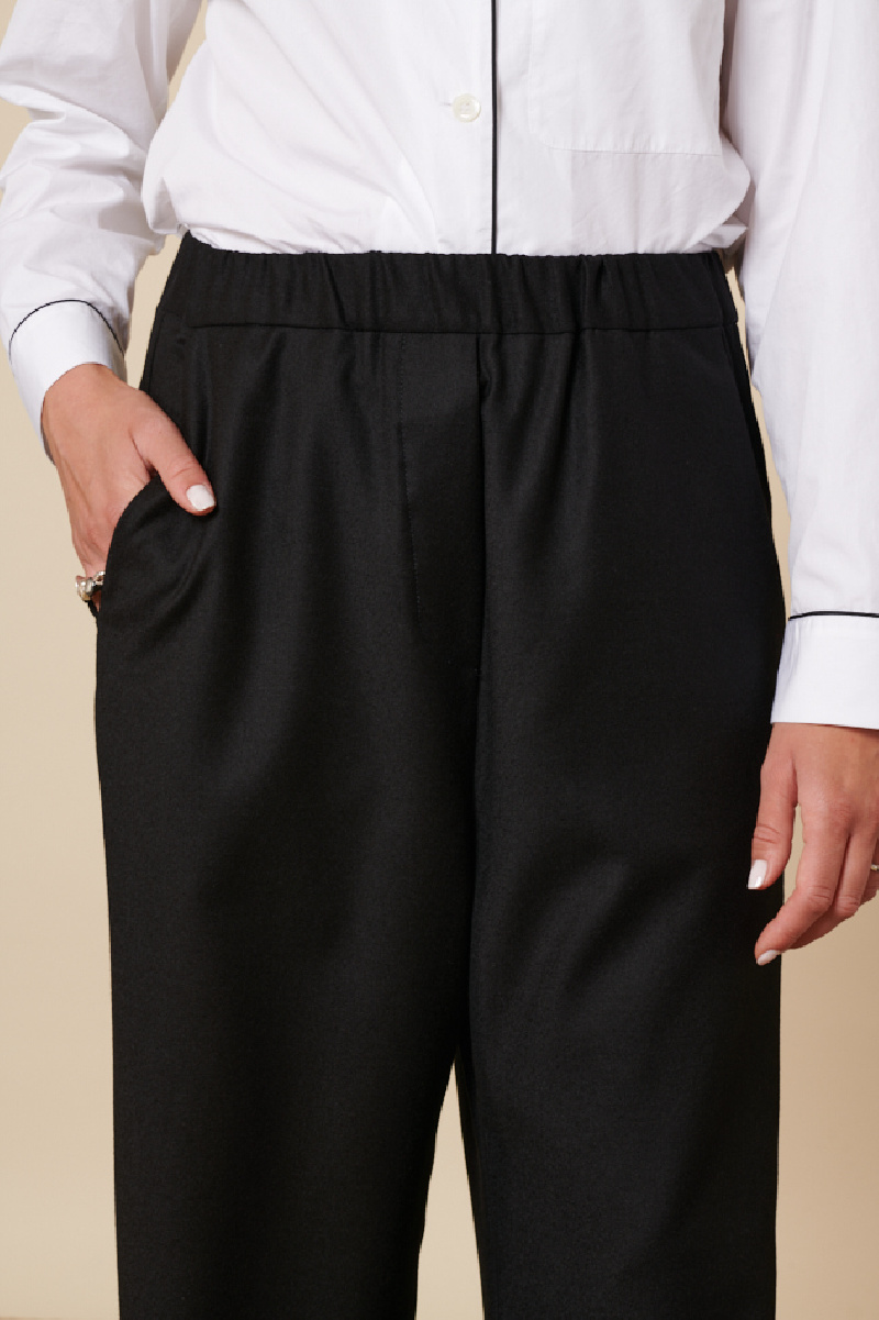 Le Pantalon tailleur Mariano, de la marque Barena, couleur noir, présente une taille classique, et une coupe ample, avec deux poches latérales fendues, une taille élastique, et une fausse braguette
