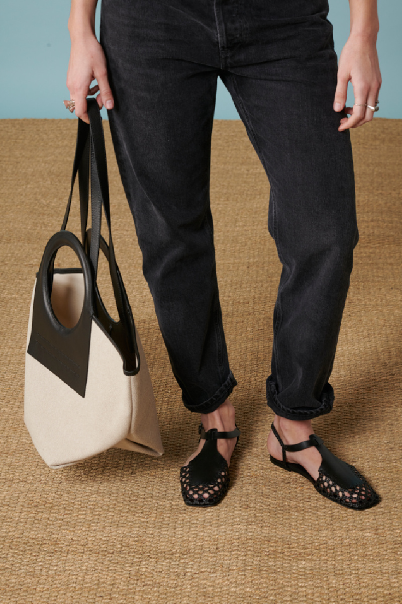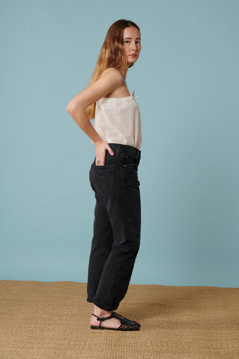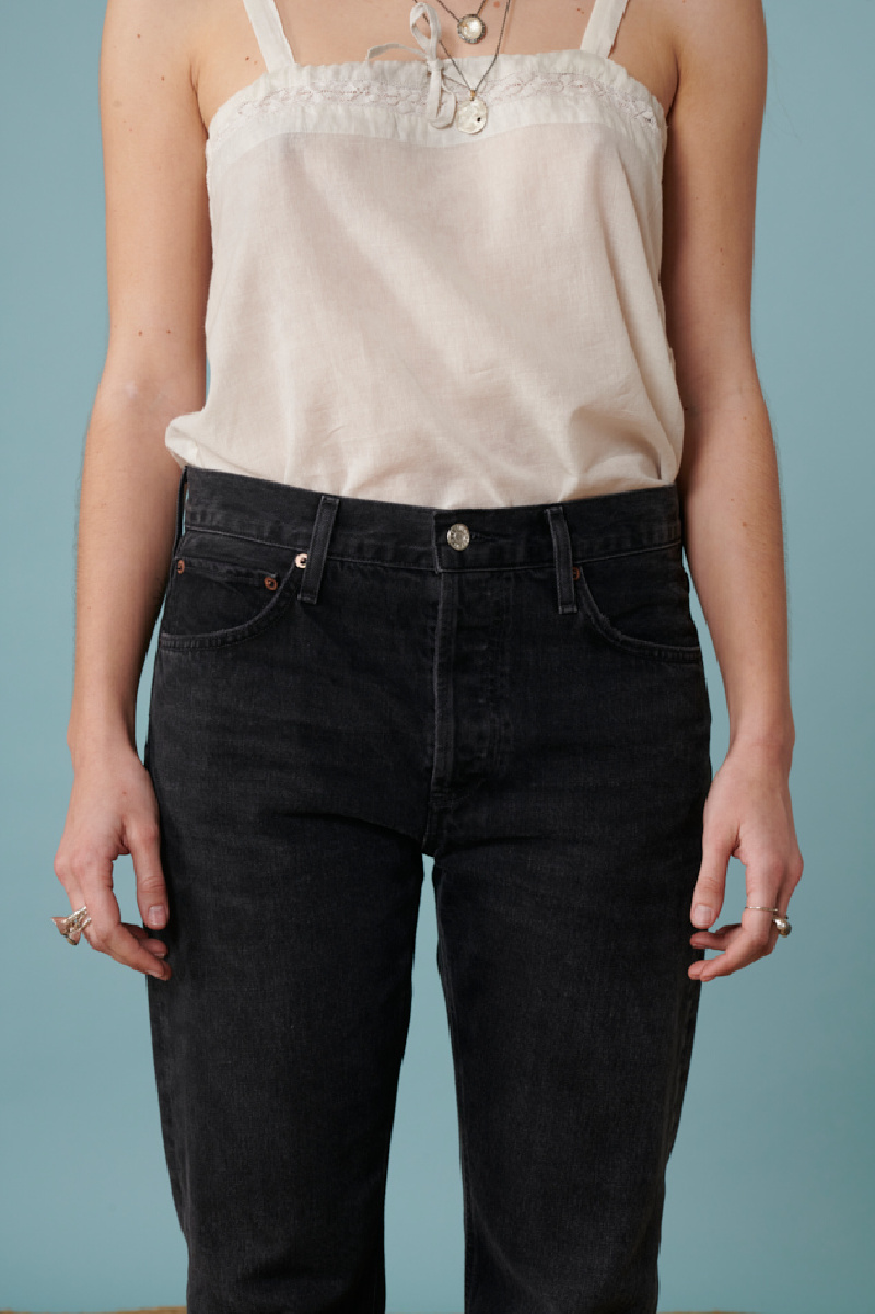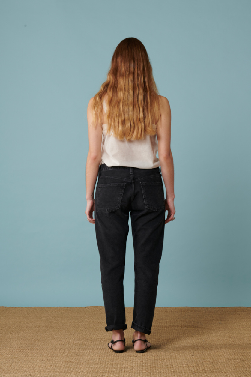 Jean Parker noir délavé de la marque Agolde, denim en coton organique noir, fermeture boutonnée, coupe large, base droite.
