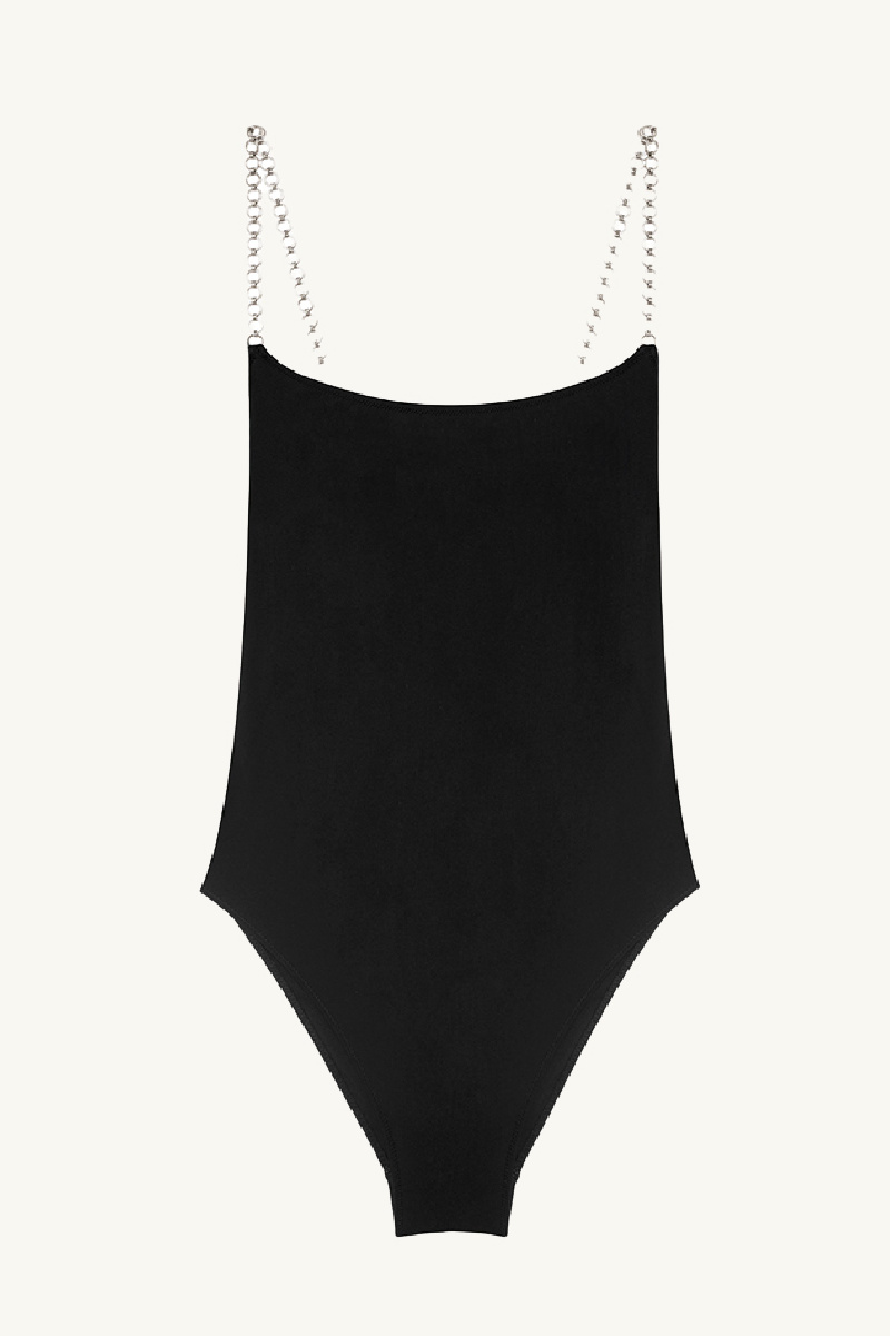 Maillot de bain modèle Trentasei de la marque Lido. Bretelle en chaines argentés, tissu noir stretch lisse, décolleté arrondie. Ce maillot est confectionné localement dans le nord de l'Italie.