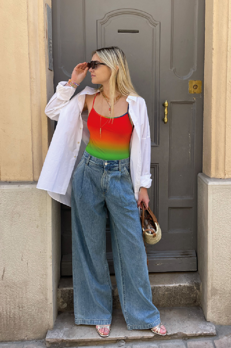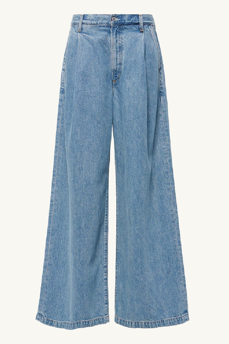 Jean Ellis coupe palazzo coloris Baffle de la marque Agolde. Denim bleu moyen, fermeture braguette zippée et bouton, poches fendues latérales, et poches arrières, coupe ample oversize.