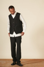 La veste sans manches Herringbone de la marque Sage de Crêt, en noir, se caractérise par un col en V, une coupe droite et cintrée, une fermeture à boutons noirs, ainsi que deux poches plaquées de chaque côté et une poche sur la poitrine gauche. Elle est également dotée d'un cordon de serrage avec des boutons pour un ajustement au bas du dos.