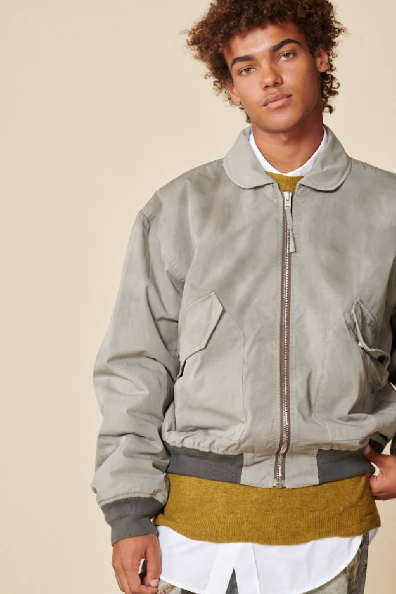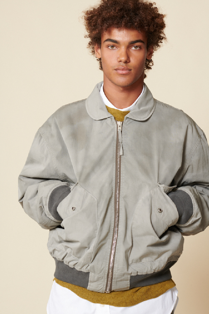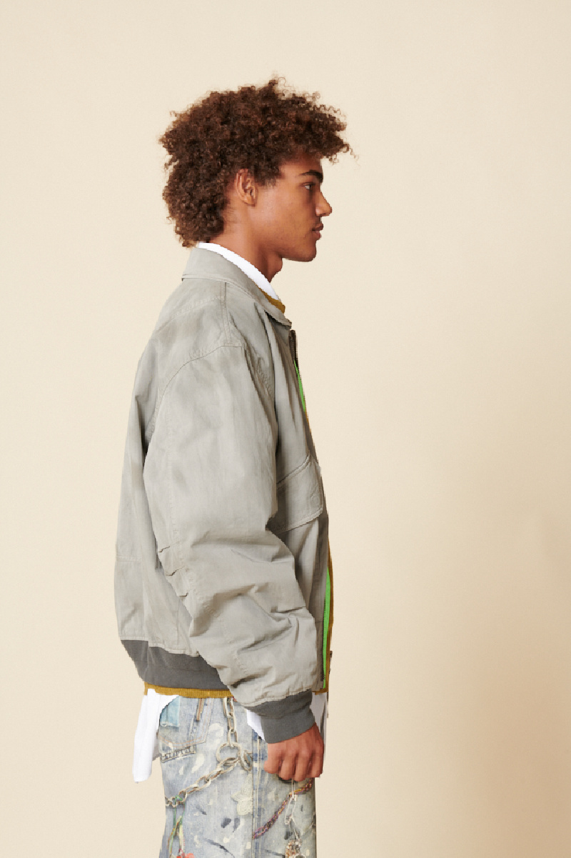 Bomber mid-grey en coton de la marque Acne Studios, ce modèle se distingue par sa taille ajustée, ses emmanchures basses et son col rabattable. Il est doté d'une fermeture éclair argentée, de deux poches latérales arborant le logo "Acne Studios", et d'une poche intérieure. Son intérieur et sa doublure en vert fluo ajoutent une touche de contraste audacieuse, tandis que les finitions côtelées contrastées complètent son design élégant.