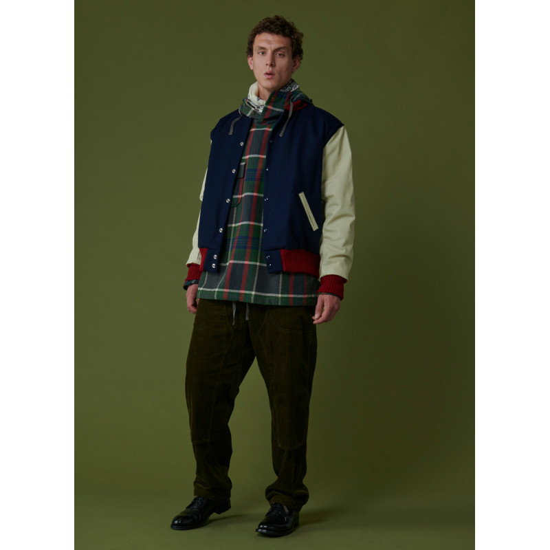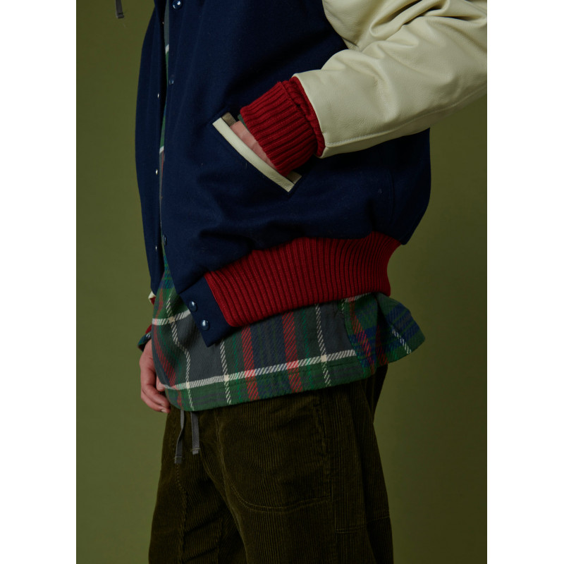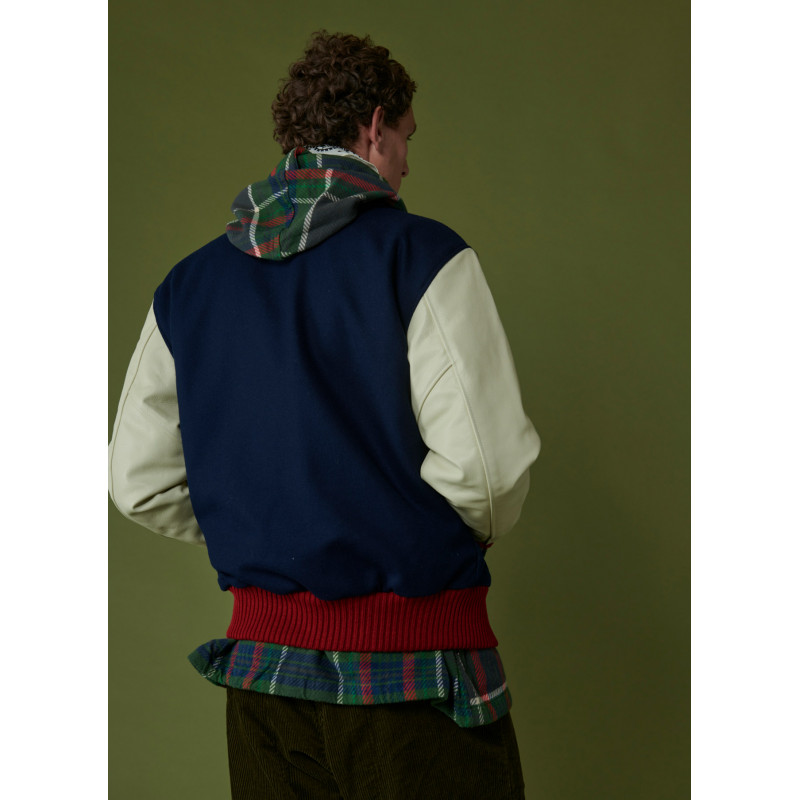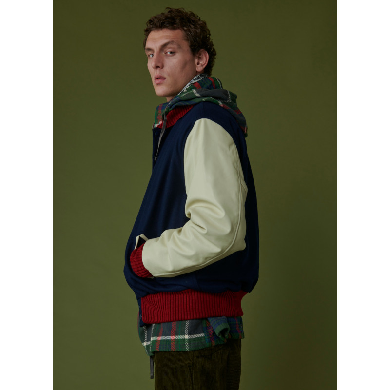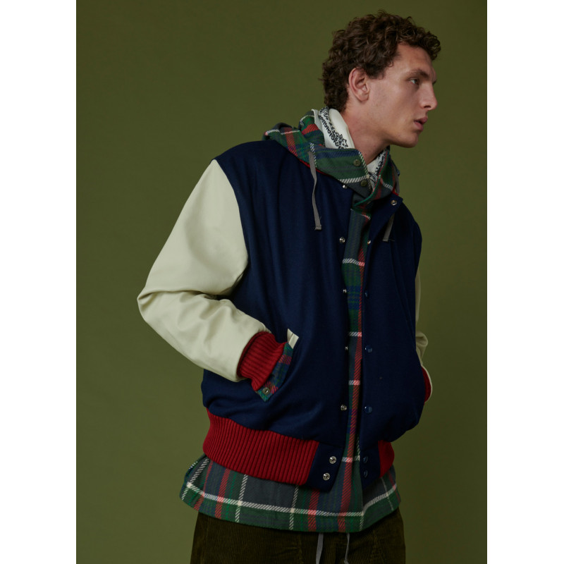 Veste bomber teddy navy/ melton, Engineered Garments, fermeture à boutons, poches passepoilées avec détails blancs en cuir, et manches en cuir blanches, coupe décontractée, longueur hanches, tour de coup rouge, de même pour les détails au poignet et sur le tour de hanches.