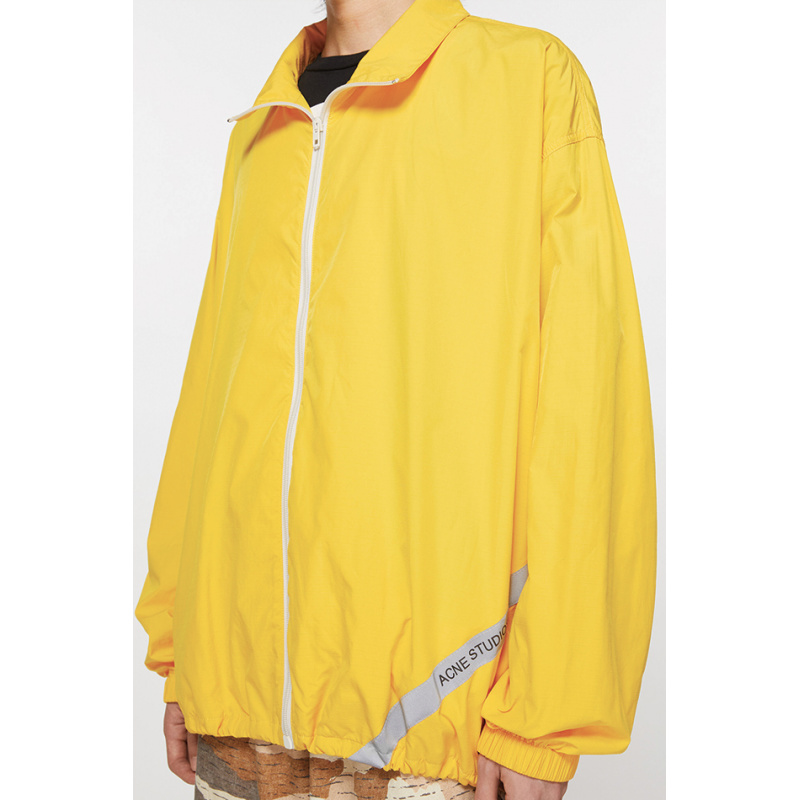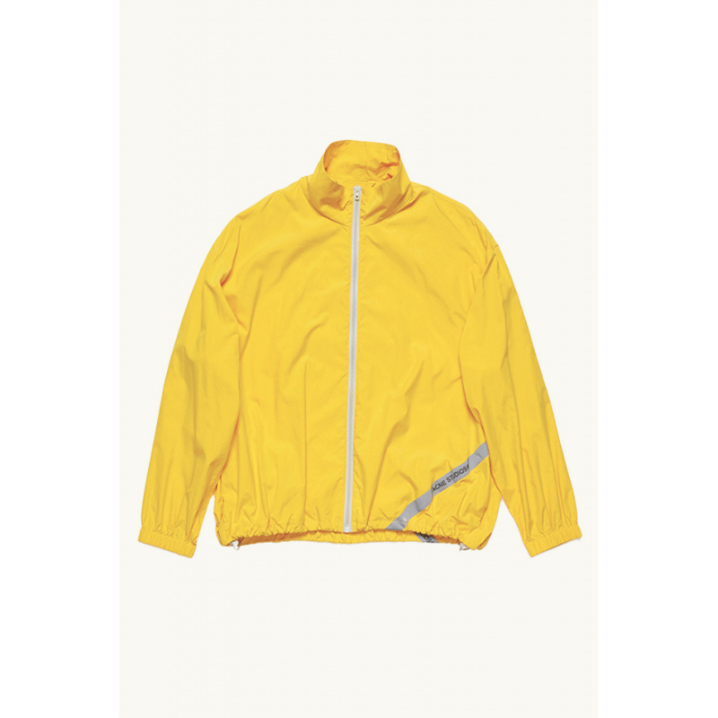 Veste de la marque Acne Studios, jaune, coupe oversize, longueur au niveau des hanches, fermeture éclair, tissus léger, élastiques en bas, et bande réfléchissante logotypée.