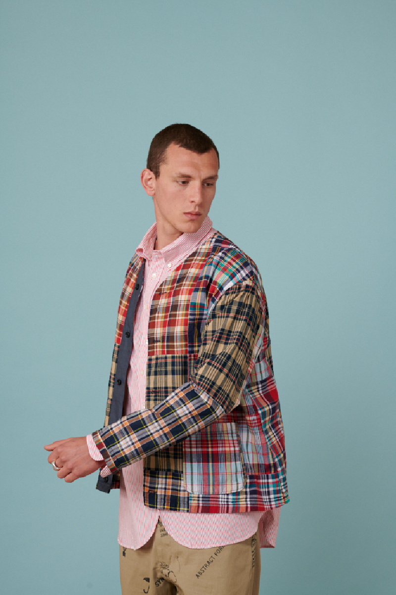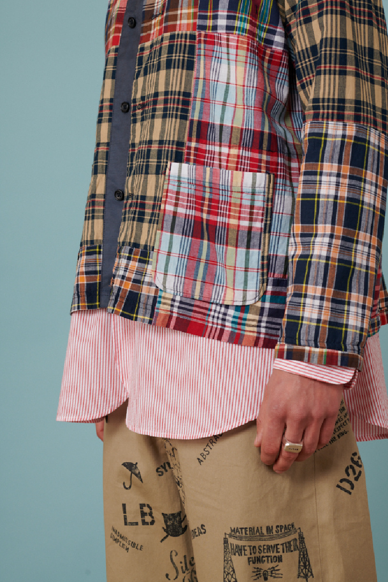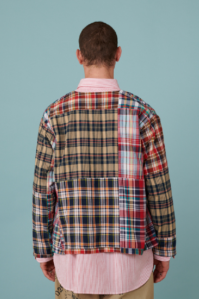 Veste fine Patchwork madras à carreaux navy et multicolor, de la marque Engineered Garments. Assemblage patchwork, poches plaquées sur l'avant, col V avec détail bleu sur la boutonnière. Coupe droite.